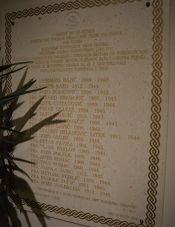 U Franjevačkoj provinciji Presvetoga Otkupitelja (Split) 44 fratra bili su žrtve Drugoga svjetskog rata i poraća, a od njih u Cetinskoj krajini 20. Iz poštovanja prema njihovoj prolivenoj krvi i mučeničkoj smrti, u prigodi slavlja 300. obljetnice slavne pobjede pod Sinjem uz Gospin zagovor, sinjski franjevci su u samostanskom klaustru 2016. godine postavili brončane reljefe cetinskih mučenika, kao i spomen-ploču na kojoj su sljedećim generacijama na trajan spomen predana njihova imena.