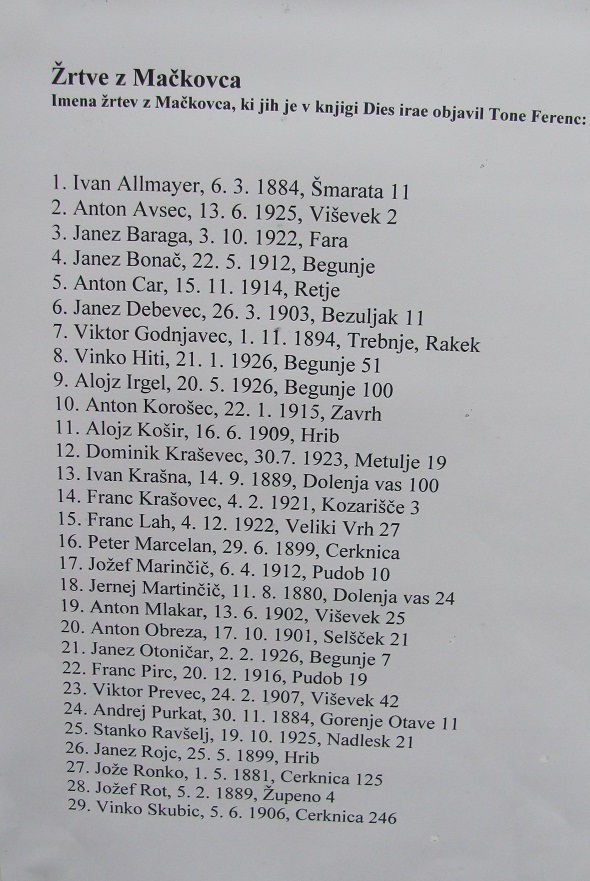 26. listopada 2013. započela su iskapanja na području Mačkovca gdje su pronašli šesnaest kostura koji su pokopani u zajedničku grobnicu na groblju u Begunjama pokraj Cerknice.