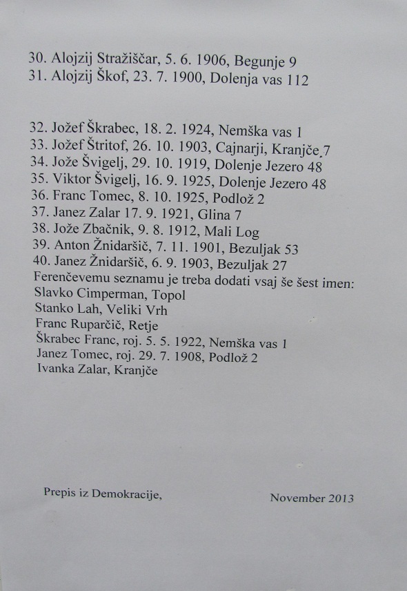 28. listopada 1943. godine partizanske su jedinice hladnim oružjem zaklale 44 Slovenaca ratnih zarobljenika iz općina Bloke, Cerknica, Loška dolina i Loški potok. Komunisti nisu pokapali žrtve, pa su njihove posmrtne ostatke rasule divlje životinje po šumama što je onemogućilo prikupljanje svih ostatka tih žrtava.