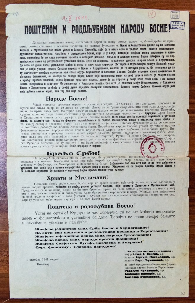 Dok četničke i partizanske formacije intenzivno vrše masovne pokolje Muslimana i Hrvata po Hercegovini, Lici, Krajini, Bosni, Slavoniji itd., licemjerno se isti narodi pozivaju ovim proglasom na zajedničku borbu! U oči iz ovog proglasa jako upada i boldirani uvećani naslov „Braćo Srbi“ dok su ispod odvojeni s umanjenim i tankim slovima naslovljeni Hrvati i Muslimani a koji nisu nazvani „braćom“ kao Srbi. Mnogo toga je vidljivo iz ovog dokumenta kao npr. četnički uzvik „na okup“, te završetak proglasa u kojem piše: