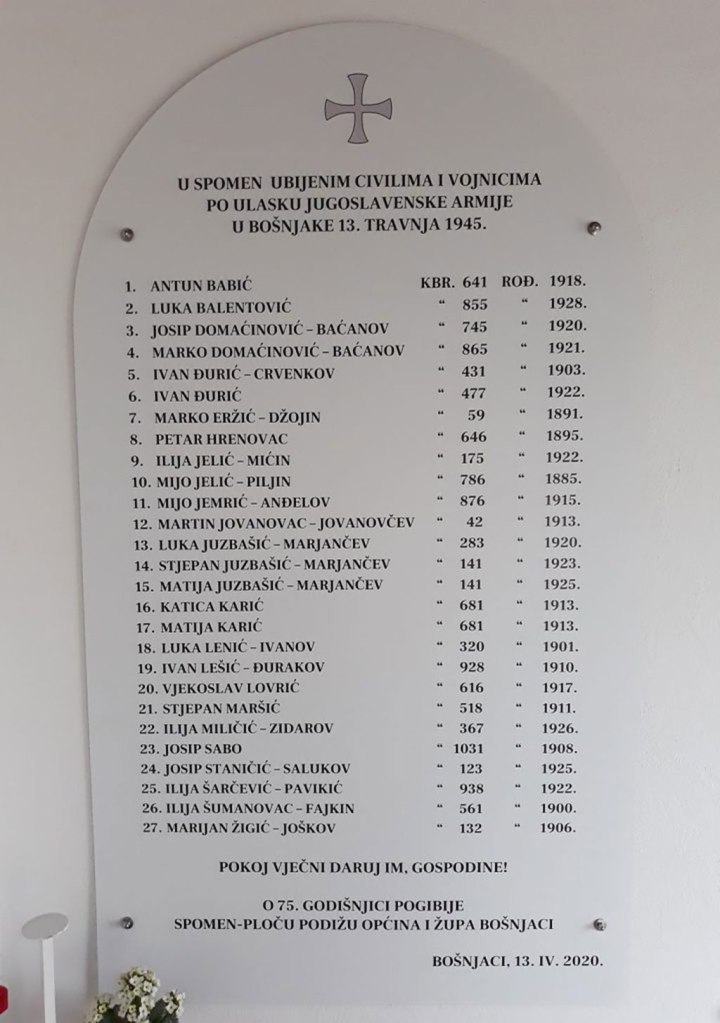 Bošnjaci su naseljeno mjesto i općina u Hrvatskoj, u Vukovarsko-srijemskoj županiji. Do teritorijalne reorganizacije u Hrvatskoj nalazili su se u sastavu stare općine Županja. Kako i sva druga mjesta pa tako i ovo nije prošlo bez počinjenih zločina i žrtava od strane Titove jugoslavenske režimske komunističke vojske. Budući da stanovnici Bošnjaka ne zaboravljaju svoje žrtve pokrenuta je inicijativa da se podigne spomen-ploča žrtvama Jugoslavenskog režima pa je tako u kapelici prošteništa Drage Gospe Bošnjačke je u utorak 13. travnja 2021. godine, otkrivena je i blagoslovljena spomen-ploča ubijenim civilima i vojnicima po ulasku jedinica Titove Jugoslavenske armije u Bošnjake 13. travnja 1945.