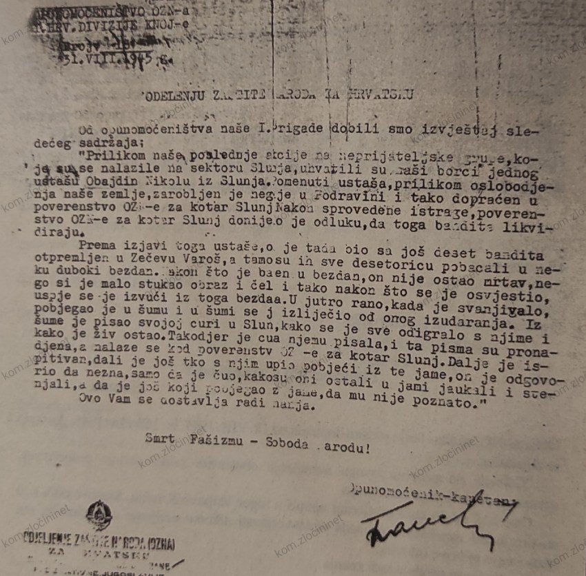 Prema izjavi toga ustaše, on je tada bio sa još deset bandita otpremljen u Zečevu Varoš, a tamo su ih svu desetoricu pobacali u neki duboki bezdan. Nakon što je bačen u bezdan, on nije ostao mrtav, nego si je malo stukao obraz i čelo i tako nakon što se je osvjestio, uspjeo se je izvući iz toga bezdana. U jutro rano, kada je svanjivalo pobjegao je u šumu i u šumi se je izliječio od onog izudaranja. Iz šume je pisao svojoj curi u Slunj, kako se je sve odigralo s njime i kako je živ ostao. Takodjer je cura njemu pisala, i ta pisma su pronadjena, a nalaze se kod poverenstva OZN-e za kotar Slunj. Dalje je ispitivan, dali je još tko s njim uspio pobjeći iz te jame, on je odgovorio da nezna, samo da je čuo, kako su oni ostali u jami jaukali i stenjali, a da je još koji pobjegao iz jame, da mu nije poznato.”